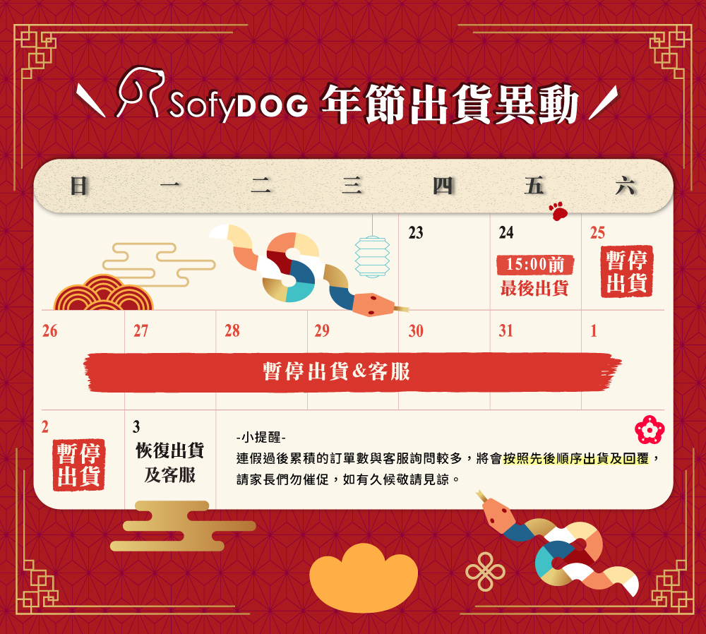 2025年春節繁盛期間配送調整公告 2024-12-31 網站公告 ❗春節繁盛期間宅急便及宅配通配送時效調整公告❗ 春節繁盛期將至,「黑貓宅急便」及「宅配通」皆有配送服務調整,請家長們留意,盡早幫毛孩準備糧食,避免物流貨件過度集中導致配送延遲。 「黑貓宅急便」及「宅配通」2025年春節期間配送調整如下: 暫停「當日寄件當日配達服務」。 無法指定配送日期、無法指定時段配達、無法保證隔日配達。 離島地區受航班載能受限,無法確切掌握到貨日,訂購前請斟酌配達日期。 部分需等待入倉的特殊點,無法保證可配達時間。 詳情請參詳 黑貓宅急便官網 及 宅配通官網 公告 返回網站公告