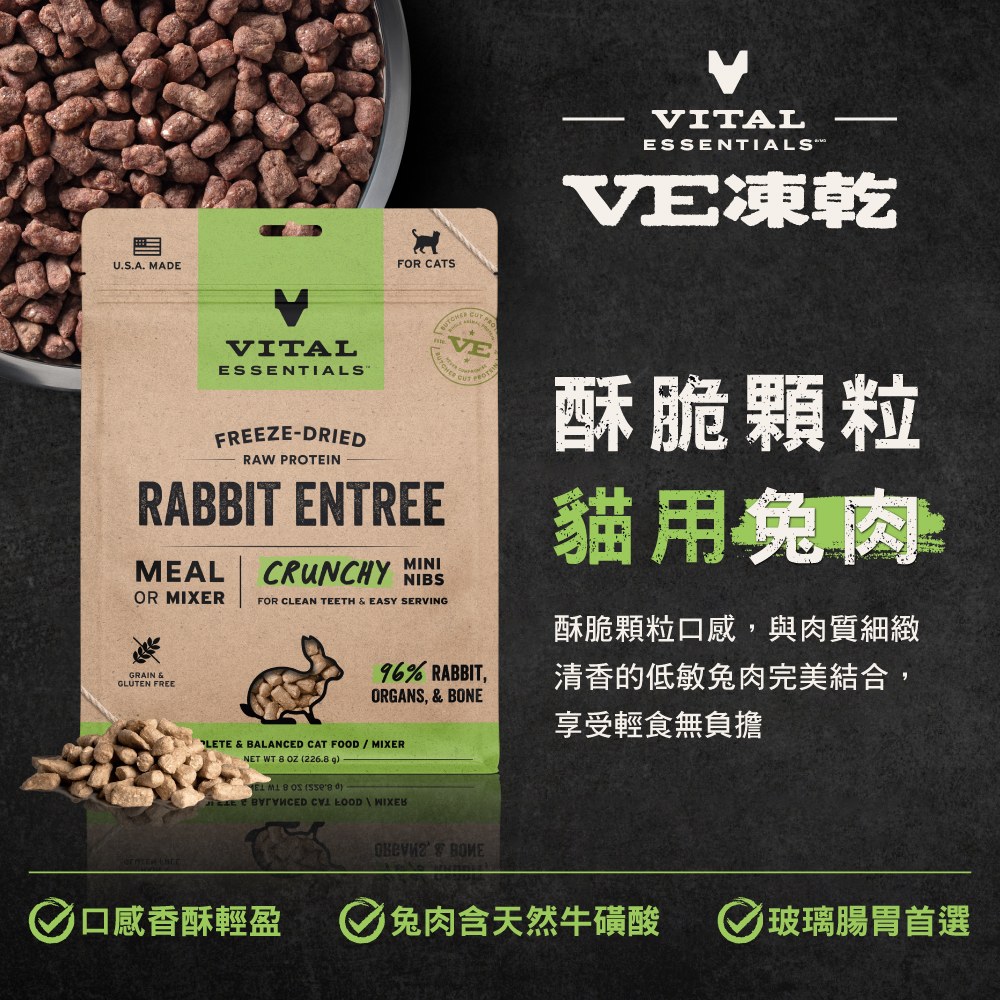 - 來自美國「VITAL ESSENTIALS」,採用全球獨創分離溫層技術,最大程度保留天然營養與原始風味。酥脆顆粒香酥咔滋,豐富飲食體驗。