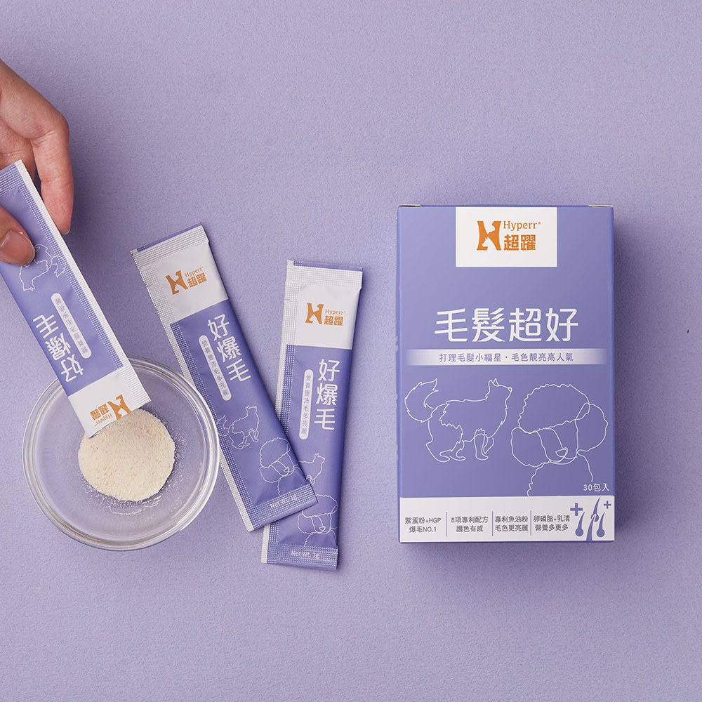 Hyperr毛髮超好保健品,獨家專利配方,幫助毛髮鮮豔亮麗,保護皮膚守護肌底。頂規調配解決毛髮困擾。特選配方:1、專利水解蛋黃粉,小分子高蛋白,有助於毛髮健康。2、專利於膠原蛋白,幫助皮膚柔順光澤。3、專利鮭魚精華,幫助強韌毛髮。Hyperr毛髮超好保健品,獨家專利配方:4、專利咖啡梅果精粹,幫助抵抗自由基,養護髮根幫助毛色亮麗。5、專利魚油粉,維持毛髮油亮光彩。6、專利鱉蛋粉,有助皮膚保健,提供毛髮生長所需營養。7、膠原蛋白胜肽,幫助鎖水保持皮膚彈性。8、天然酵母B群,守護肌底使毛髮健康。專業獸醫師王詩梅醫師推薦。各國專利認證,品質有保證。撕開即食,保養即時,每10公斤以下一天1包,10公斤以上一天2包。