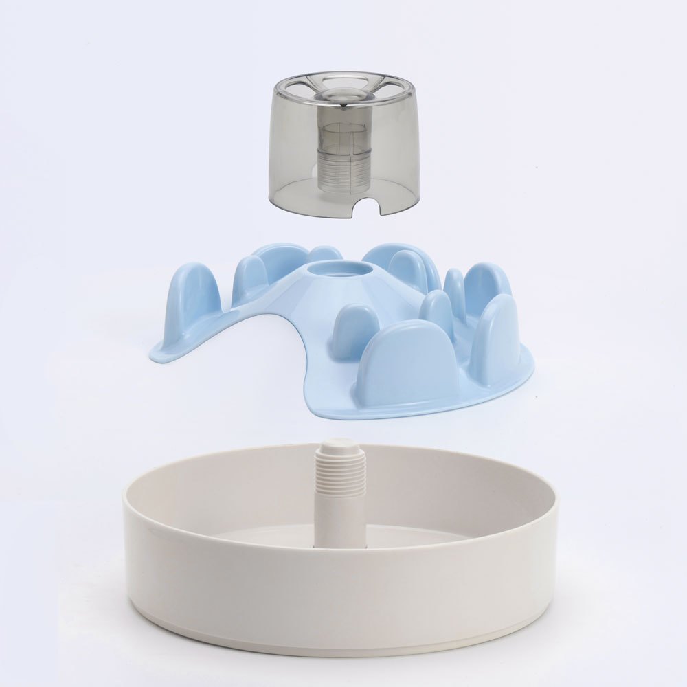 迷宮:不規則高低差設計,搭配特殊儲量蓋,在找食的過程中可以漸進式掉落食物,幫助訓練寵物慢食。不規則紋路可以分隔食物,必須旋轉才能找到迷宮飯!