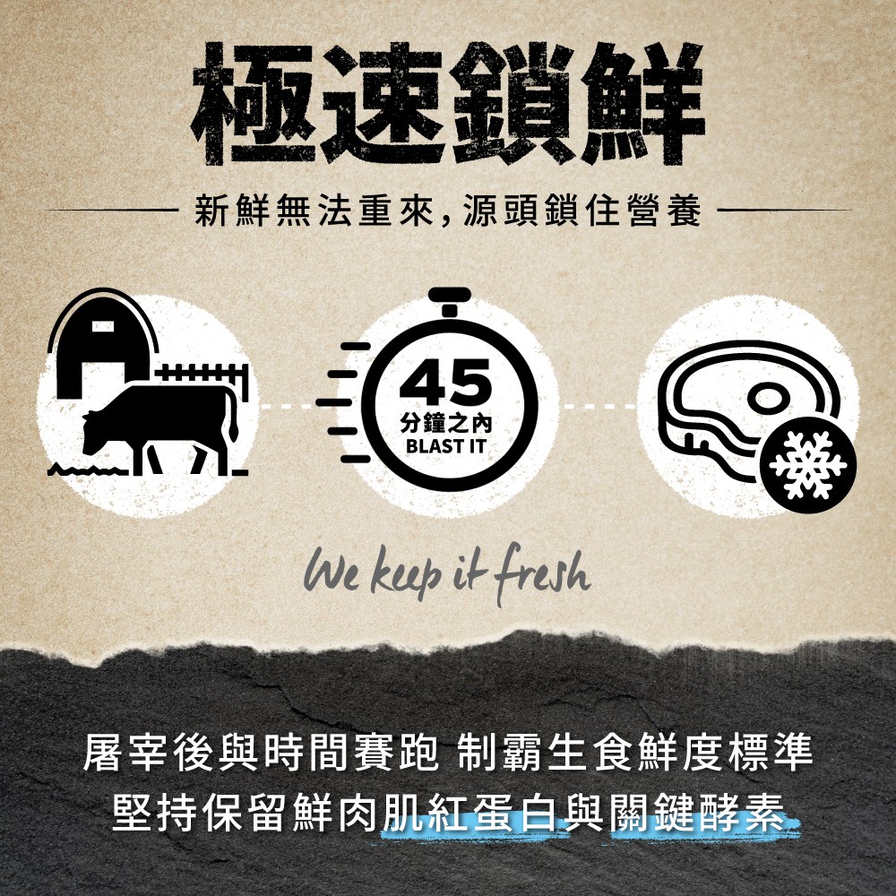 - 來自美國「VITAL ESSENTIALS」,採用全球獨創分離溫層技術,嚴選屠宰級完整鮮肉塊,並於45分鐘內即進入急速冷凍流程,再透過低溫冷凍乾燥製程,最大程度保留天然營養與原始風味。